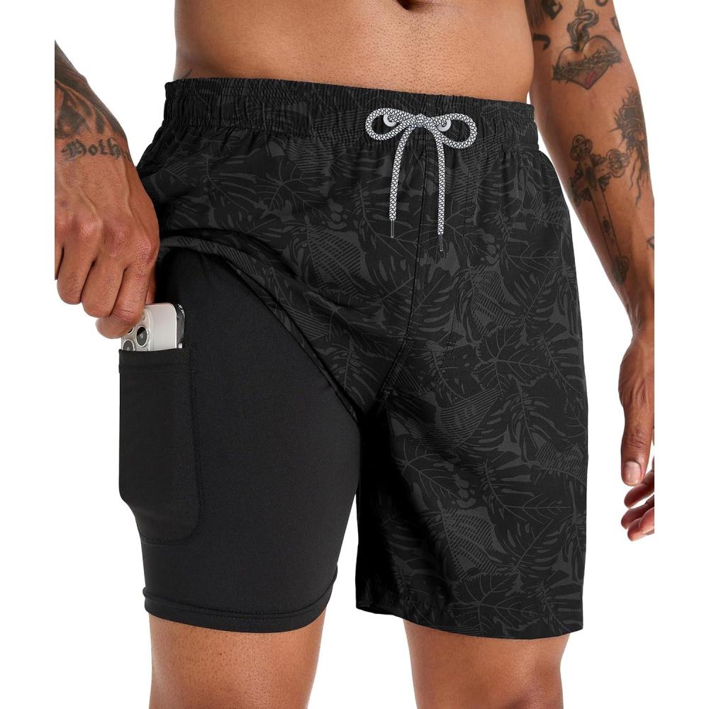 APTRO Men’s Swim Trunks with Compression Liner 5 Inch Bathing Suit Beach Swimsuits(Black Leaf)